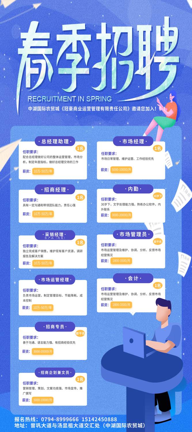 總經理助理、招商經理、農產品(肉類)采銷經理、市場運管經理各1名