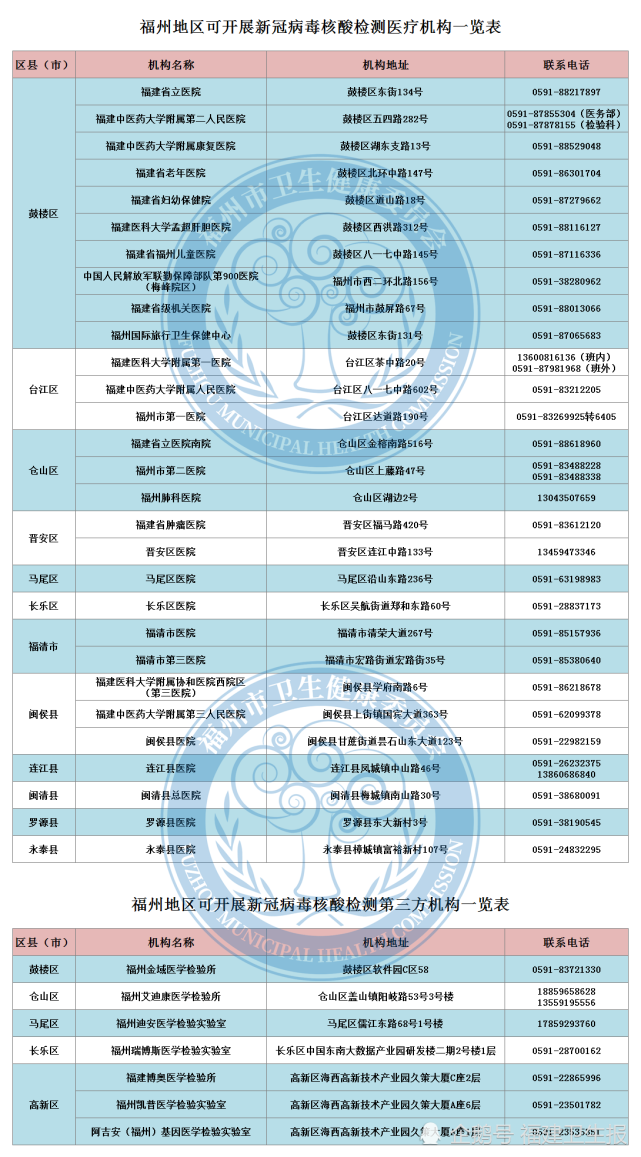 福州地區可開展新冠病毒核酸檢測醫療機構、第三方機構名單