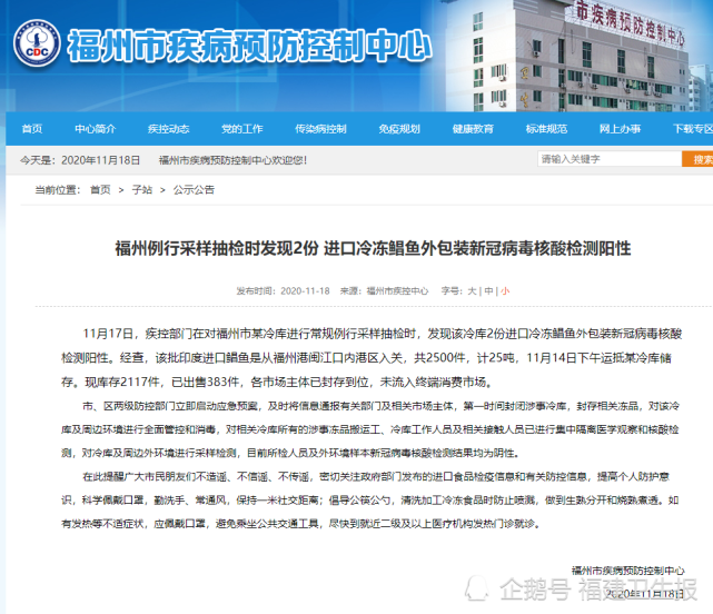11月17日,疾控部門在對福州市某冷庫進行常規例行采樣抽檢時,發現該冷庫2份進口冷凍鯧魚外包裝新冠病毒核酸檢測陽性。經查,該批印度進口鯧魚是從福州港閩江口內港區入關,共2500件,計25噸,11月14日下午運抵某冷庫儲存。現庫存2117件,已出售383件,各市場主體已封存到位,未流入終端消費市場。市、區兩級防控部門立即啟動應急預案,及時將信息通報有關部門及相關市場主體,第一時間封閉涉事冷庫,封存相關凍品,對該冷庫及周邊環境進行全面管控和消毒,對相關冷庫所有的涉事凍品搬運工、冷庫工作人員及相關接觸人員已進行集中隔離醫學觀察和核酸檢測,對冷庫及周邊外環境進行采樣檢測,目前所檢人員及外環境樣本新冠病毒核酸檢測結果均為陰性。在此提醒廣大市民朋友們不造謠、不信謠、不傳謠,密切關注政府部門發布的進口食品檢疫信息和有關防控信息,提高個人防護意識,科學佩戴口罩,勤洗手、常通風,保持一米社交距離;倡導公筷公勺,清洗加工冷凍食品時防止噴濺,做到生熟分開和燒熟煮透。如有發熱等不適癥狀,應佩戴口罩,避免乘坐公共交通工具,盡快到就近二級及以上醫療機構發熱門診就診。