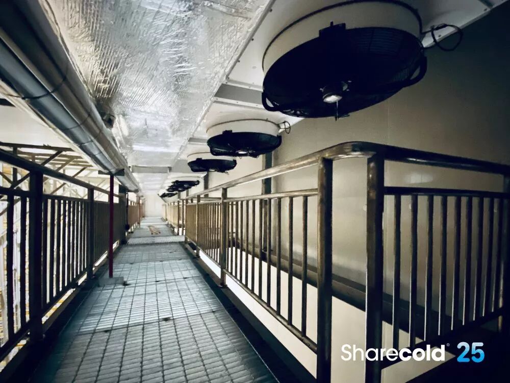 此項目五個冷間中的三個,凈高都達到了19.5米。站上冷風機的檢修平臺,腳下是19.5米高的區域,旁邊就是高位貨架。頭頂上工作著的,正是貨艙式冷風機。有點恐高的人,或許還不敢登上檢修平臺。