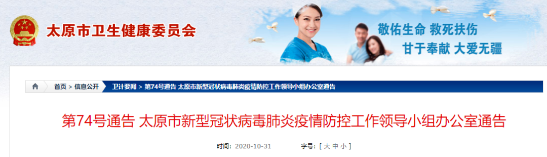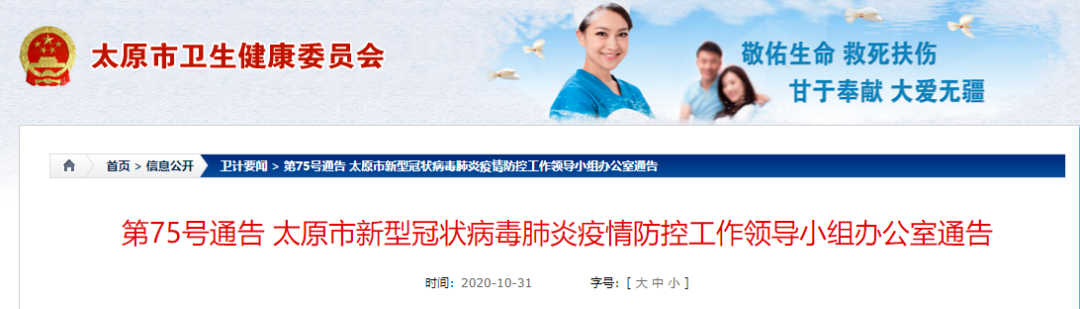 太原市新冠病毒肺炎疫情防控 工作領導小組辦公室 2020年10月31日