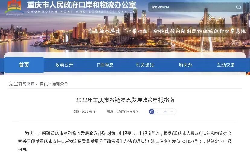 為進一步明確重慶市冷鏈物流發展政策補貼對象、申報要求、申報流程等,根據《重慶市人民政府口岸和物流辦公室關于印發重慶市支持口岸物流高質量發展若干政策操作辦法的通知》(渝口岸物流發〔2021〕20號),特制定本申報指南。