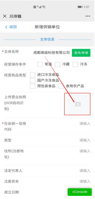 【第三步】:點擊圖10中的上傳營業執照,系統通過智能識別營業執照信息填寫該供銷單位信息,同時并完善該供銷單位的如圖 11 所 示的其余信息。