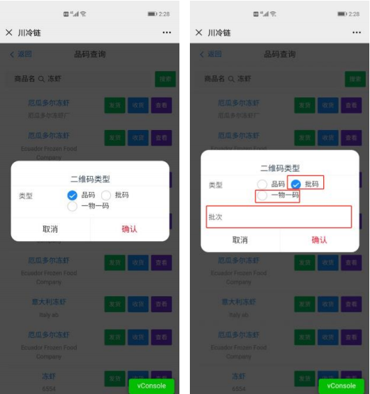 2)如圖13-3所示,選擇“批碼”或者“一物一碼”時,需要輸 入產品的批次號,批次號的輸入格式為“20201025”(代表是2020 年10月25日的產品),點擊確定后悔出現圖14-2所示界面,點擊 【打印】按鈕,可以打印“批碼”和“一物一碼”,打印方式參考 1.7.2 和1.7.3。“批碼”、“一物一碼”的品碼編號用于進口凍品申 報中的“商品條碼”欄填 寫。3)點擊圖13-1中的【收貨】、【發貨】按鈕對打印出的二維碼 掃碼收發貨。