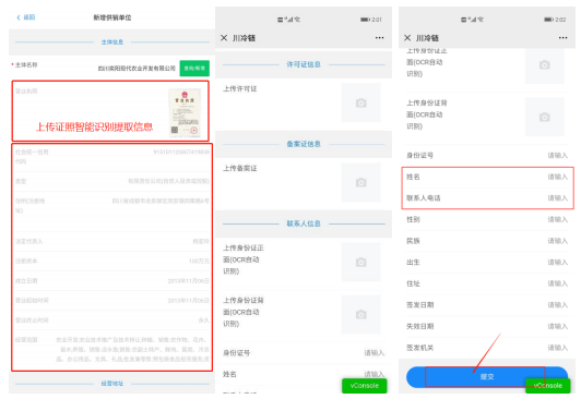 【第一步】:可模糊輸入企業名稱查詢該企業是否已在平臺上備案,若企業已備案則會出現如圖5所示的藍色詞條,點擊對應的主體名稱,再點擊【查詢/新增】按鈕,則會出現該公司的基礎信息,檢查基礎信息是否正確和完善,若不正確則修改并完善主體信息;【第二步】:若輸入企業名稱后沒有查詢到該企業信息,則點擊【查詢/新增】按鈕,通過上傳企業營業執照智能識別的方式識別企業的相關信息。識別完成后,檢查識別信息是否有誤,如果有誤則手動修改完善信息,無誤則填寫后續相關信息;【第三步】:完成“經營地址”、“許可證信息”、“備案證信息”、“法人身份證信息”的填寫和上傳,完成后點擊提交;