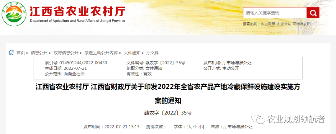 江西省農業農村廳 江西省財政廳關于印發2022年全省農產品產地冷藏保鮮設施建設實施方案的通知