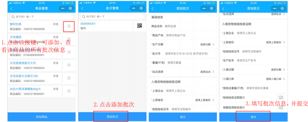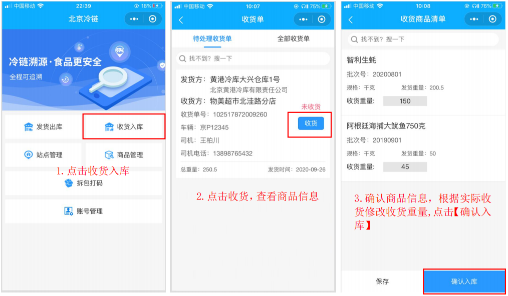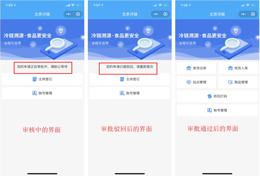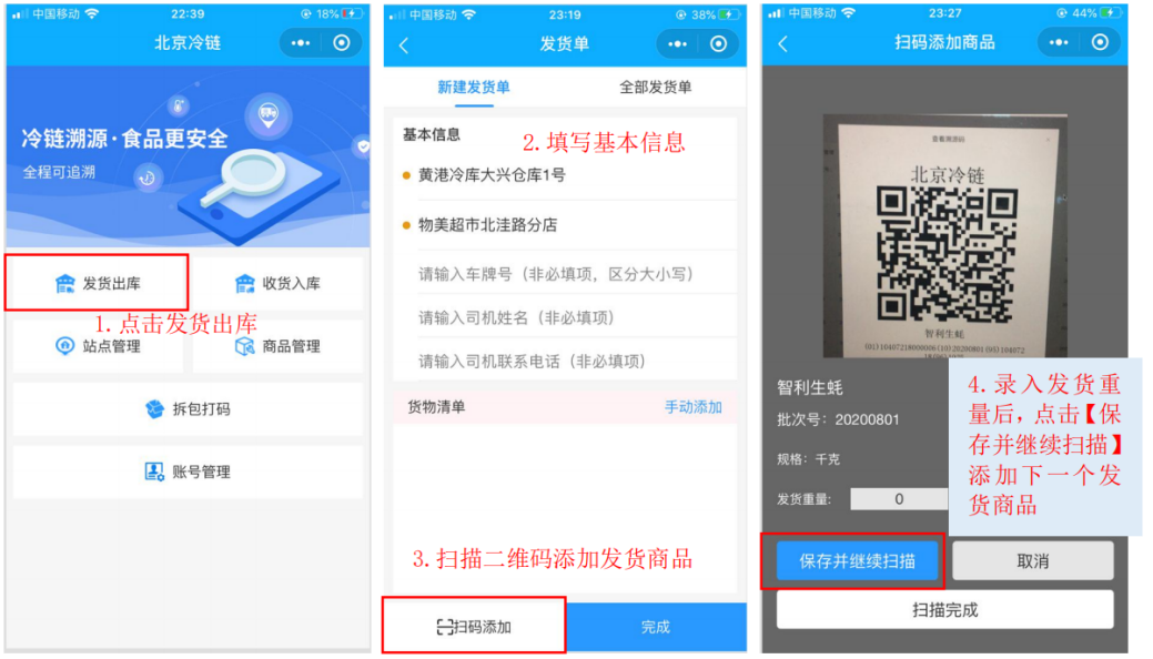 為強化進口冷鏈食品疫情防控工作,加深進口冷鏈食品“可追溯、可監管、可查詢”,方便冷鏈食品企業自我管理。溫泉鎮市場監管所向所有企業普及“北京冷鏈”小程序操作規范: 第一步: 掃描下圖所示二維碼或在微信中搜索“北京冷鏈”添加小程序 第二步: 注冊賬戶、主體登記。具體操作流程如下圖所示 第三步: 登錄小程序查看認證結果。下圖分別為審核中、審批駁回與審批通過的界面。若審批被駁回,企業管理員需登錄PC端查看駁回理由,根據理由修改并提交企業資質信息。 登錄小程序后,點擊【賬號管理】,可修改密碼或解除綁定。 第四步: 企業管理員 微信小程序為企業管理員提供了五個功能:站點管理、商品管理、發貨出庫、收貨入庫、拆包打碼。 1、 站點管理 站點管理流程如下圖所示,手機號請填寫站點用戶真實手機號,初始密碼為系統自動生成,昵稱可填寫站點用戶真實姓名 2、商品管理 第一步: 添加商品。如果商品有符合 GS1 標準的 13 位或 14 位 GTIN 編碼,請填寫 GTIN 編碼;對于沒有 GTIN 編碼的商品,請點擊【生成編碼】按鈕,系統將自動生成 14 位商品編碼。對于進口商品,生產國/地區請選擇商品的原產國。操作流程如下圖所示: 第二步: 添加批次信息。添加完商品后,需要為商品添加批次。企業管理員可以根據需要為下屬任一首站站點添加商品批次。在某批次商品尚未發貨之前,用戶可以刪除該批次。如果某批次商品已發貨,則該批次信息不可被刪除。批次信息添 加操作流程如下圖所示: ? 生產日期:如果商品為原料,請填入原料的生產日期;如果商品為加工后的成品,請填入成品的生產加工日期。 ? 批次號:批次號為 6-20 位,可以包含數字和字母,不可以包含特殊字符。根據企業實際業務情況,批次號可以為商品外包裝上的批次碼、商品的生產日期、進貨入庫日期、企業內部使用的批次編號。 ? 上游省份:如果進口商品的入境口岸在北京,則上游省份請選擇北京。 ? 入境貨物檢驗檢疫證明:證明編號、生產批號、入境日期、入境口岸和報檢總重量請與實際入境貨物檢驗檢疫證明上信息保持一致。檢驗檢疫證明圖片需要清晰、無遮擋。圖片文件格式可以為 jpg、png、bmp、jpeg,文件大小需要小于 10M。 ? 核酸檢測報告圖片:檢測報告圖片需要清晰、無遮擋。圖片文件格式可以為 jpg、png、bmp、jpeg,文件大小需要小于 10M。 第三步: 下載二維碼。點擊【二維碼圖標】,可查看并下載二維碼。 發貨出庫 發貨操作流程如下: 收貨入庫 收貨操作流程如下: 相關信息 來源:市場監管所