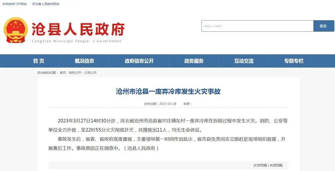 據河北省滄州市滄縣人民政府官網28日消息,?2023年3月27日14時30分許,河北省滄州市滄縣崔爾莊鎮東村一廢棄冷庫在拆除過程中發生火災。消防、公安等單位全力撲救,至22時55分火災徹底撲滅,共搜救出11人,均無生命體征。看了一下官方的通報,主要領導第一時間作出批示,感覺領導都非常重視打工人的生命。這場大火是從昨天下午2點30分開始著火,直到晚上10點55分才徹底撲滅,大火燒了8個多小時,可見火勢非常大。據當地一位村民介紹,事發的倉庫是當地的老紅棗市場,被一個老板買下后準備進行開發。一個工頭承包下拆除倉庫的活,結果工人們在拆除過程發生了火災,他聽說工頭已被警方控制。不過呢,讓我想不通的是,領導們都這么重視了,但昨日新聞媒體都保持著沉默,人們都不知道發生了火災。要知道大洋彼岸發生的槍擊案之類的傷亡事故,國內媒體都是第一時間就會報道。此外,通報提到共搜救出11人,均無生命體征。但通報中并沒有提到當時在冷庫中一共有多少人。有多少人受傷,多少人失蹤,官方是否也應該向大眾通報一下呢?相信很多人看到這個新聞的時候,都感覺匪夷所思,為何只是拆出一個冷庫,又不是易燃易爆品或者化工產品倉庫,怎么會造成這么大的火災?冷庫的可燃物大致可分為三類:保溫材料、貨物外包裝、制冷劑。冷庫火災隱患,主要存在以下三個方面:1.大量使用液氨作為制冷劑。我國冷庫的制冷系統主要采用液氨作為制冷劑。一旦液氨發生泄漏,將會迅速成為有毒的氨蒸汽,對現場工作人員身體造成傷害。且氨蒸汽是爆炸性氣體,當空氣濃度達到爆炸范圍值時,遇到火源就有可能發生爆炸。2、建造冷庫采用了非阻燃保溫庫體,有的隔熱層中填充物是稻谷殼,在墻壁上要進行二氈三油的防潮構造處理遇到火源就會發生燃燒。3、冷庫年久失修,電氣設備老化或使用不當會導致火災發生。冷庫中使用的照明燈、冷庫風機、電加熱門的使用不當以及電線的老化也會引發火災。目前還不清楚河北滄州的這一座廢棄冷庫,在拆除過程中因何原因發生的火災。但很明顯,官方的通報過于簡潔,并不能解答人們關心的問題。家屬們的心態也很穩定,但在目前的媒體環境中,好像也只能等通報了。