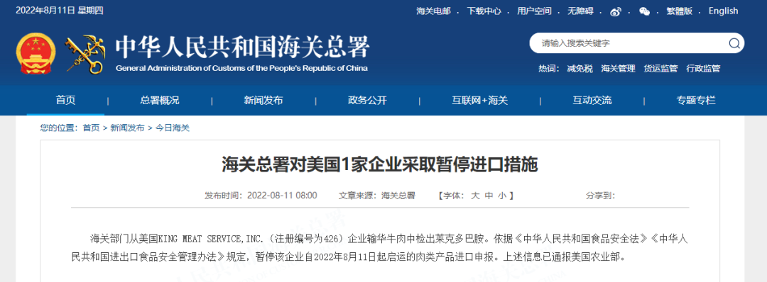 海關對美國1家牛肉企業采取暫停進口措施!8月11日,中國海關總署官網更新,暫停受理美國注冊編號為426企業自2022年8月11日起啟運的輸華肉類產品進口申報。