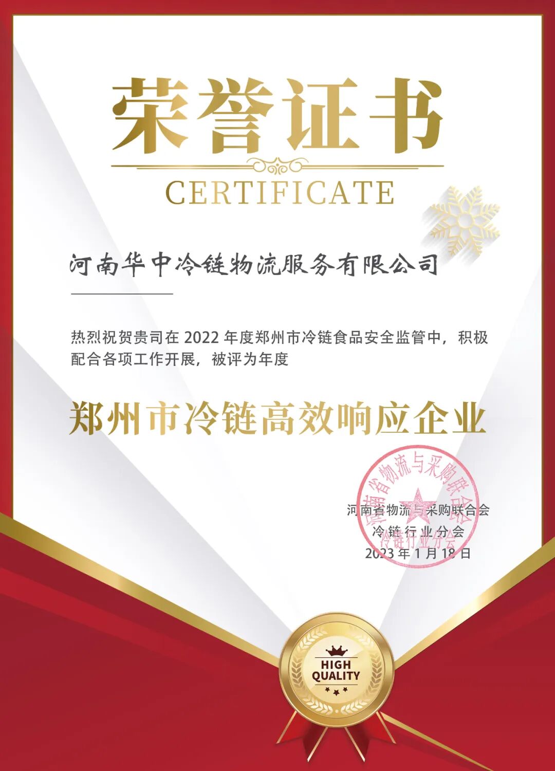 經過公司領導的努力和所有同事的合力協作,華中冷鏈于2022年被評為“首批年度鄭州市食品冷鏈先進企業”。