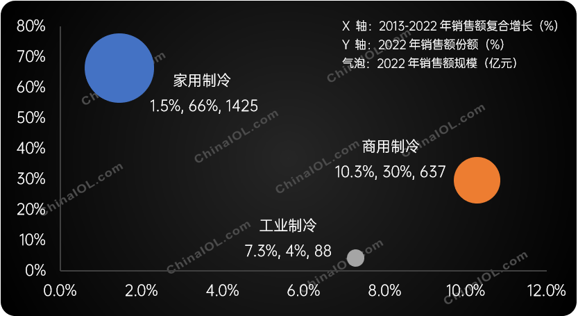由于制冷設備行業品類眾多,且分屬產業不同,所以在發展中體現了不同的特點。從2013-2022年長周期來看,家用、商用以及工業制冷設備都實現了不同程度的增長,其中商用制冷成長性最高,復合增長高達10.3%,其次是工業制冷復合增長率為7.3%,家用制冷市場相對比較平穩。