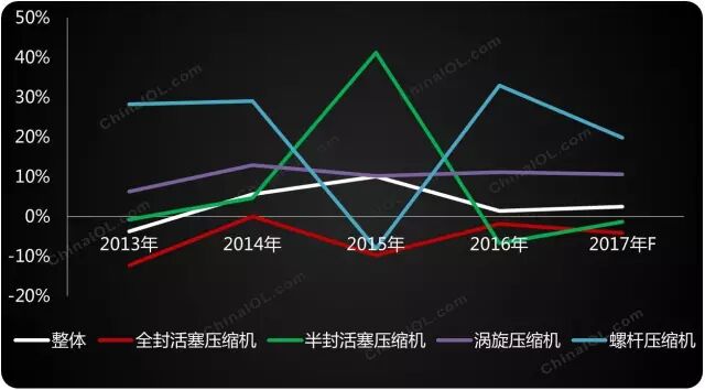 從細分產品來看,近年來,活塞壓縮機市場空間被壓縮,市場增幅低于行業平均水平,渦旋壓縮機性價比優勢明顯,近幾年市場增幅領先于行業平均水平。螺桿壓縮機成本有所降低,冷鏈范圍擴大,2016年市場恢復性增長。曾有傳言,半封活塞壓縮機將被渦旋壓縮機和螺桿壓縮機替代而退出市場。