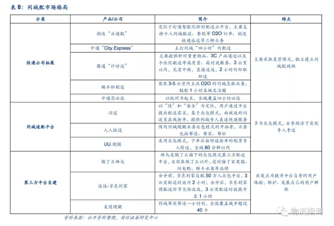 而京東、餓了么、美團等成熟平臺則通過收購或自建等方式切入同城配市場,一方面旗下同城配產品有利于優化平臺本身的服務質量,提升服務到家的時效性,另一方面平臺本身優厚的用戶量基礎也為旗下同城配產品帶來高流量。快遞企業方面,早有聯報萬象等落地配企業專注于同城快遞,而近年不少大型快遞公司特紛紛推出新產品。