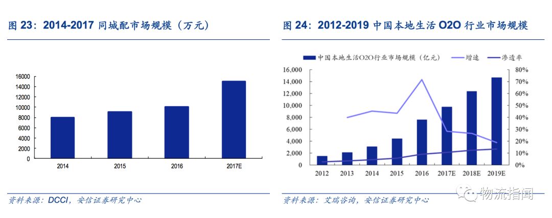 同城配市場前景廣闊,預計2017年市場規模將達1.5萬億元。目前的同城配送服務覆蓋電商O2O、快消品、家居家電等多個領域,隨著居民消費結構的提升轉變,未來前景非常廣闊。根據DCCI互聯網數據中心的數據,2016年同城配市場規模約1萬億元,預計2017年已經達到1.5萬億元規模。根據艾瑞咨詢的數據,2016年同城O2O的市場規模達到7620.6億元,預計到2019年能實現14702.1億元,年復合增速達到24.49%,O2O市場的快速成長或能驅動未來同城配業務的發展。