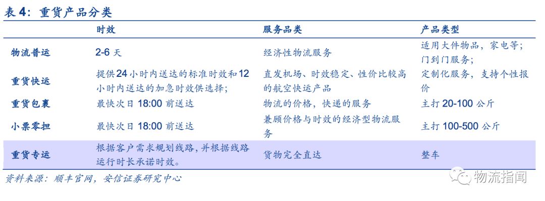 公司于2013年開展快運業務,而順豐提供的產品在快運市場中均屬于高端產品,首先推出的是物流普運與重貨快運兩個維度,主要針對20Kg以上的貨物,兩種產品主要區別一個針對經濟型貨物,另外一個針對中高端貨物;但相比較零擔市場上其他產品,該兩種產品均屬于高端系列。2018年,在此基礎上推出重貨包裹及小票零擔,相對于原來的物流普運及重貨快運是更為經濟的產品,單價約為2-3元/公斤,其從產品收費和時效上直接對標德邦精準系列。