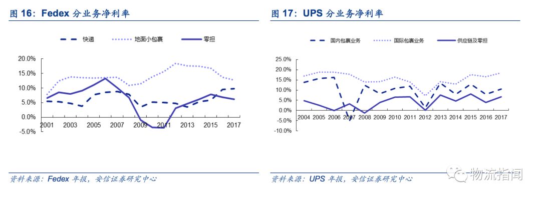 由于零擔業務進入門檻較低,所以市場競爭激烈,企業盈利能力均較差。全國成規模的零擔企業目前僅有德邦等少數企業可持續保持盈利;按UPS及Fedex財務數據考量,美國物流企業快遞業務凈利率是零擔業務約2倍左右。Fedex由于航空成本較高,其快遞業務凈利率在部分年份和零擔業務相仿;但其路面包裹業務凈利率維持在13-14%的水平,零擔業務凈利率近幾年在6-8%。UPS的國際包裹業務凈利率>國內包裹業務>供應鏈及零擔業務,分別約為17%、10%及6%。