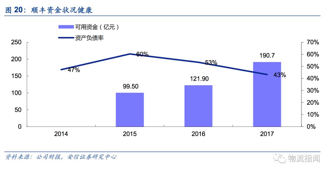 公司具備雄厚的資金實力,順豐控股于2017年年初正式通過借殼登錄A股市場,上市時募集配套資金約80億元、2017年8月定增80億,公司現資金充足,財務結構健康。截至2017年,公司資產負債率為43%,可用資金(貨幣資金庫存現金+銀行存款+其他流動資產銀行理財產品)規模達100億以上,2017年底達到190億元。