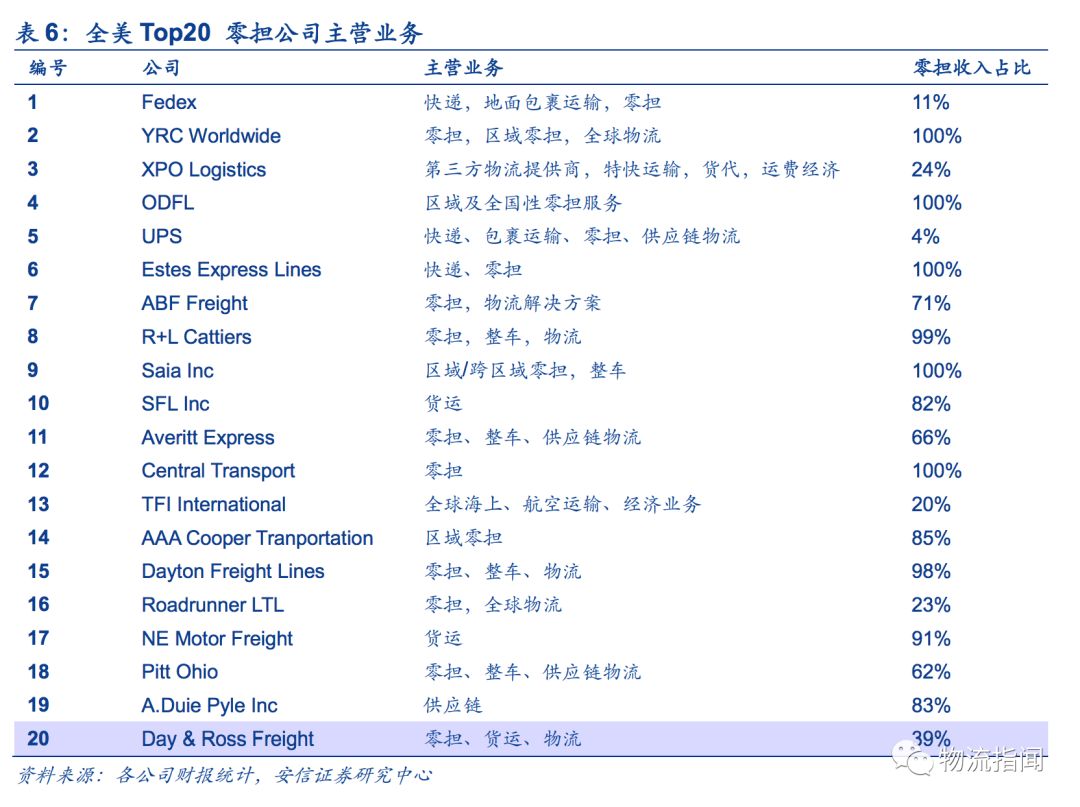 而且由于零擔業務本身的低盈利能力及有限市場增長的屬性,致使較大規模的零擔公司多是多主業經營的。美國top20零擔公司僅有5家公司純主業為零擔業務,其中約一半公司零擔業務營收沒有占到總營收的50%,主業多為盈利能力較好的快遞、地面包裹運輸類。
