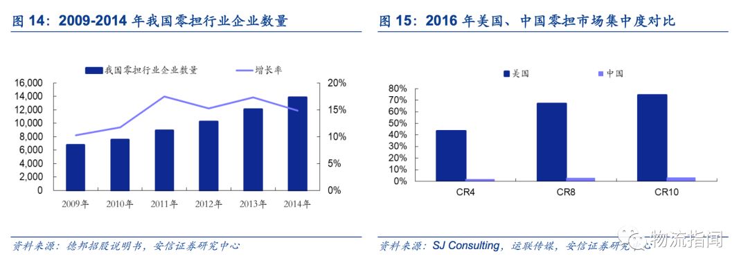 根據德邦招股說明書披露,企業數量自2012年就突破10000家,且每年都保持10%+的增速,2014年CR10僅為2%。美國零擔市場早在20世紀初起步,上世紀80年代開始管制逐步放開,如今已形成了成熟的寡頭壟斷市場,2016年行業CR4、CR8、CR10分別達到40%+、60%+、70%+,遠遠大于中國市場同時期1%+、2%+、3%+的水平。