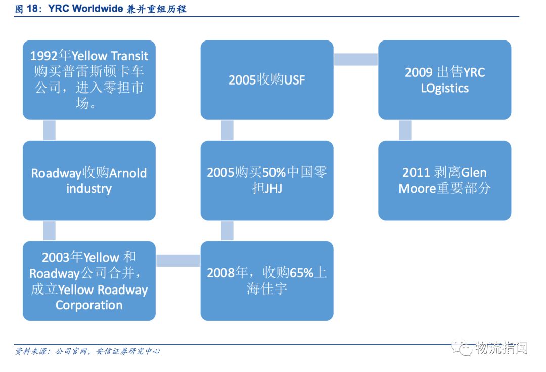 我們細看國外較大零擔物流冷鏈服務公司,幾乎都是通過兼并收購完成規模擴張。我們以YRC Worldwide為例,該公司為目前北美最大的零擔道路貨運公司之一,2017年實現營收48.9億美元。其成立于1924年,進入2000年后加速了收購的進程。主要經歷2個階段: