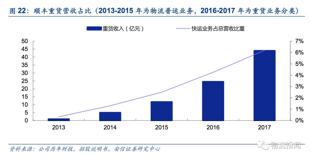公司多元業務發展,快運業務現對公司營收影響較低,2017年重貨業務營收占比僅6%。