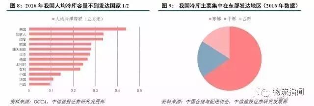 人均冷庫容量不高,而且分布不均。雖然我國冷庫總容積已經躋身全球第三,僅次于美國和印度,但是人均冷庫容積不到發達國家的1/2。根據全球冷鏈聯盟(GCCA)的數據,2016年我國人均冷庫容積為0.14立方米,遠低于美國0.44立方米和日本0.28立方米的人均冷庫容積。而且我國冷庫資源分布不均,截至2016年,65%的冷庫資源都分布在東部地區。以上海為例,人均冷庫容積達0.29立方米,遠高于全國平均水平,甚至超過日本的人均水平。