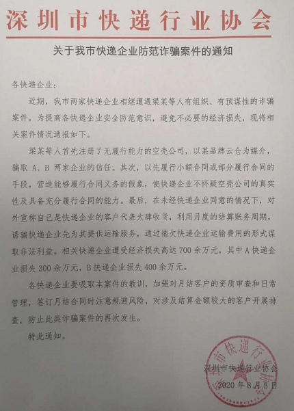 深圳市快遞行業協會提醒,各快遞企業要吸取本案件的教訓,加強對月結客戶的資質審查和日常管理,簽訂月結合同時注意規避風險,對涉及結算金額較大的客戶開展排查,防止此類詐騙案件的再次發生。