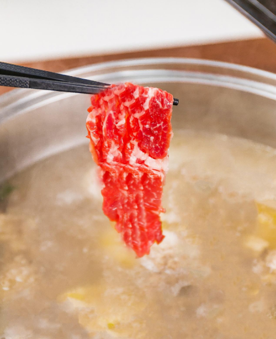 身處牛腹部夾層肉的肥牛,脂肪與紅肉一層層相隔,肉質鮮紅柔嫩,肥瘦均衡,看著就很賞心悅已。將肥牛放進鍋中,涮燙6-8秒口感佳!肉質鮮嫩,口感柔韌,不宜久煮,所以下鍋后就要抓緊吃哦~