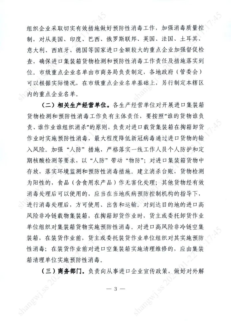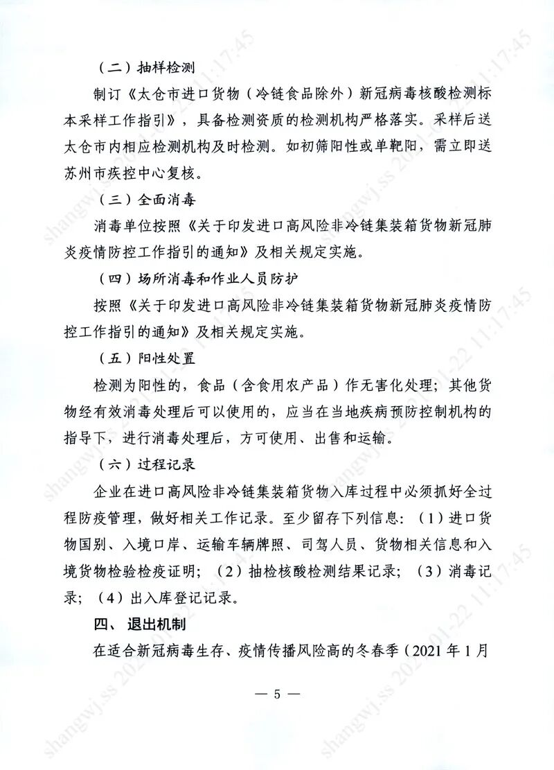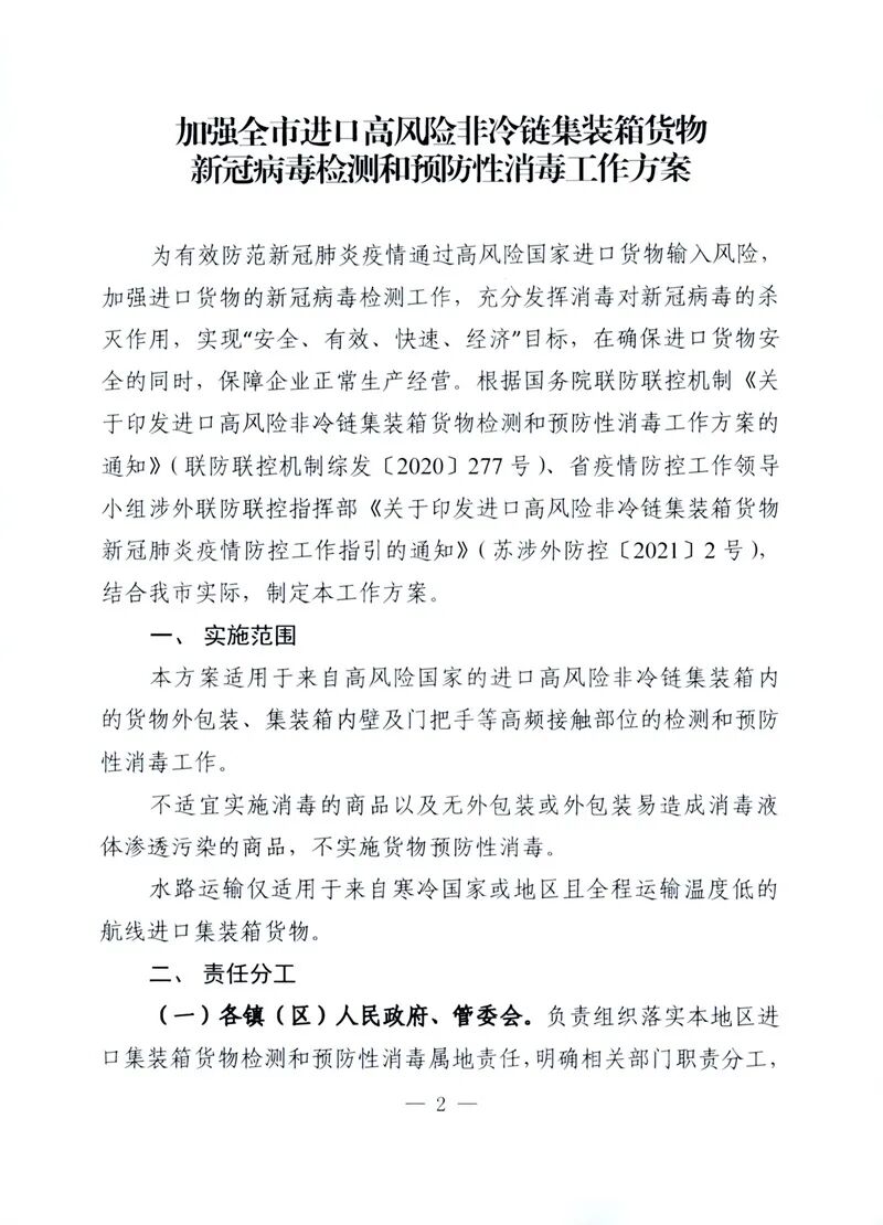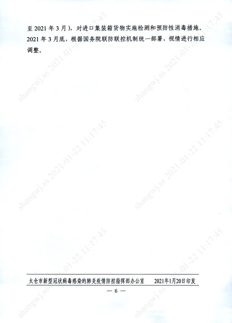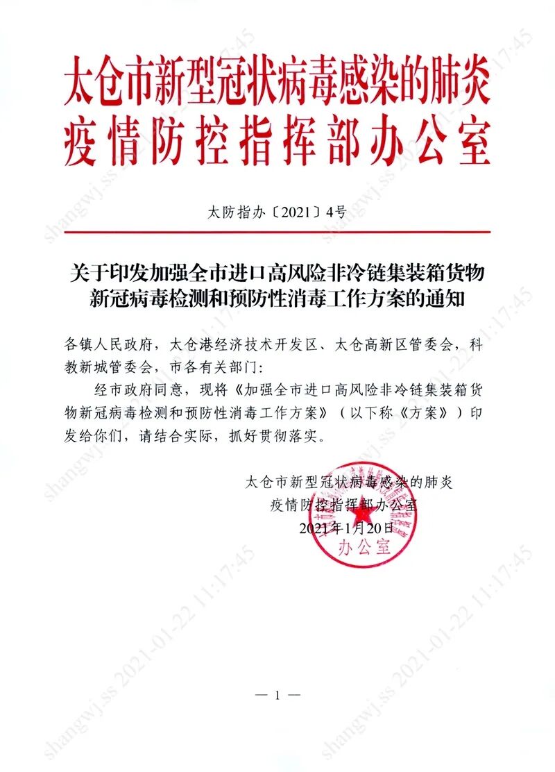 日前 市疫情防控指揮部辦公室印發了 《關于印發加強全市進口高風險非冷鏈集裝箱貨物 新冠病毒檢測和預防性消毒工作方案的通知》 對我市進口高風險非冷鏈集裝箱貨物的 檢測和預防性消毒工作作了部署 1 2 3 4 5 6 ▲ 點擊查看通知內容