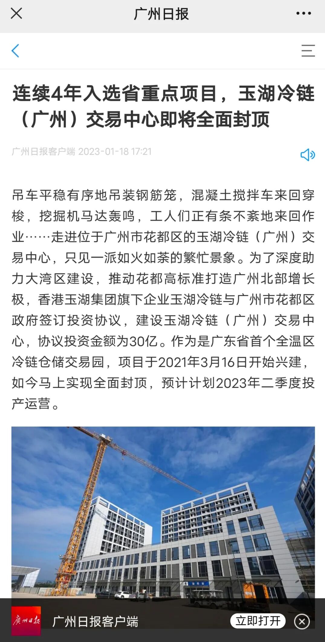 廣州日報報道:玉湖冷鏈廣州項目即將全面封頂