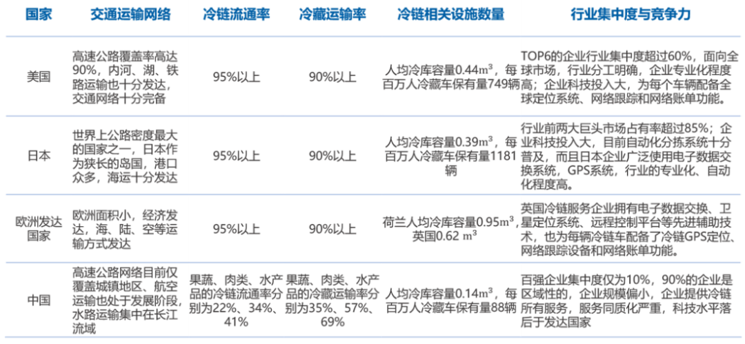 中國冷鏈物流行業在交通運輸網絡,冷鏈相關設施數量、冷鏈流通率和冷藏運輸率、行業集中度和競爭力等各方面都落后歐美日地區,中國冷鏈物流行業目前總體還處于發展階段,行業發展迅速,潛力巨大。