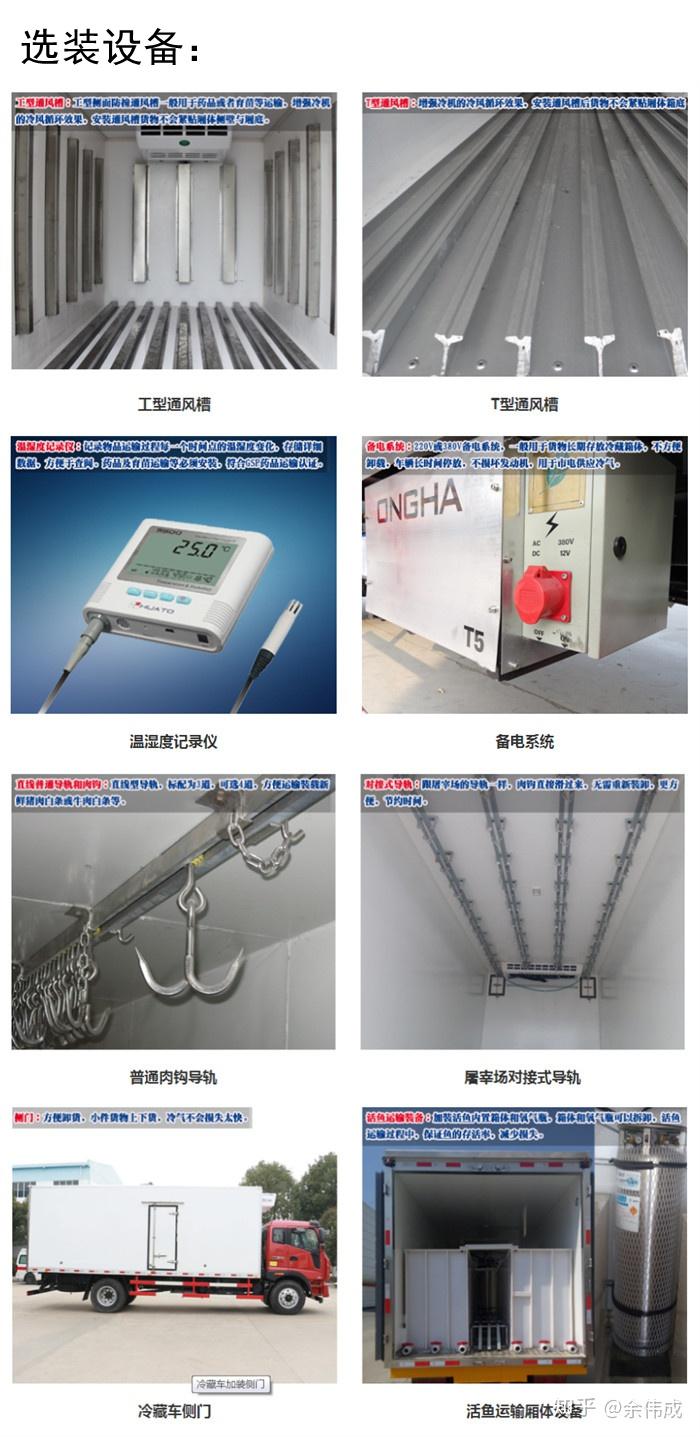 選裝部分:側門、通風槽、220/380V備電、隔板、溫度記錄儀、拆卸導軌和肉鉤、魚箱、氧氣瓶、廂體圍裙、加熱器、雙溫區間控制、貨架、不銹鋼花紋底板,后開窗、液壓尾板等。