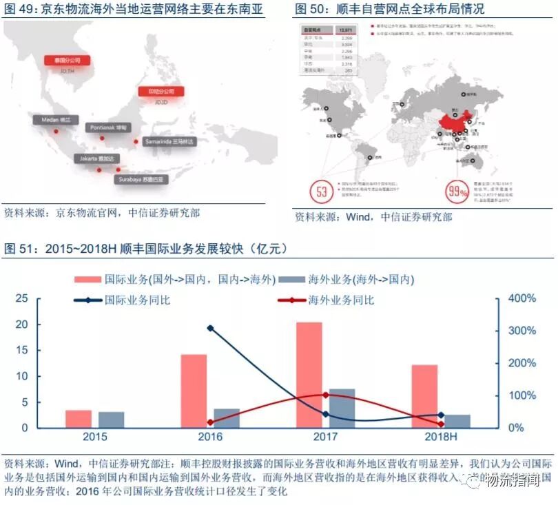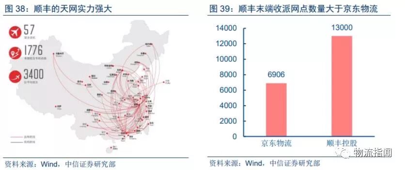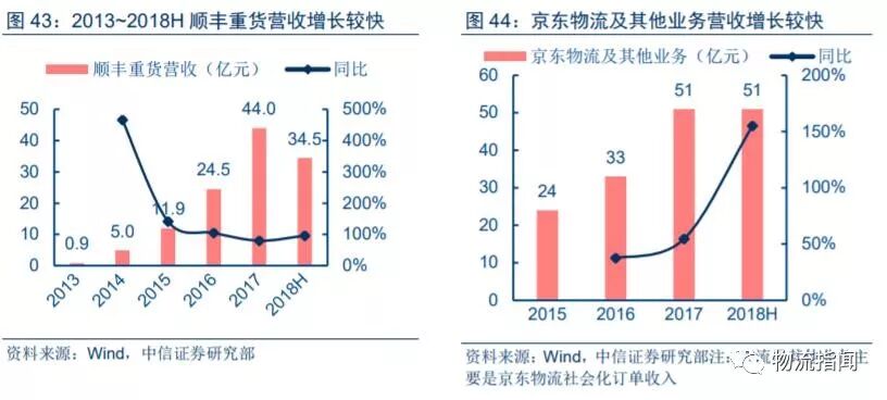 因此我們認為順豐在線下的個人及工廠端重貨實力更強一點。順豐2018年前三季度重貨收入達34.5億元,而京東財報顯示其物流及其他業務營收51億元,假設大件物流營收占比20%,則京東物流大件物流營收為10億元,顯著小于順豐重貨。