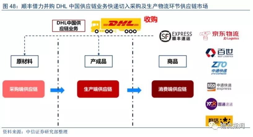 但是這些都是屬于消費端供應鏈,即最終商品的物流。DHL中國供應鏈業務在汽車、科技、生命科學、醫藥、零售、工程建造等行業內具有很強的供應鏈解決方案能力,順豐控股2018年10月通過收購DHL大中華地區的供應鏈業務成功進軍采購及生產端供應鏈行業,領先京東物流。