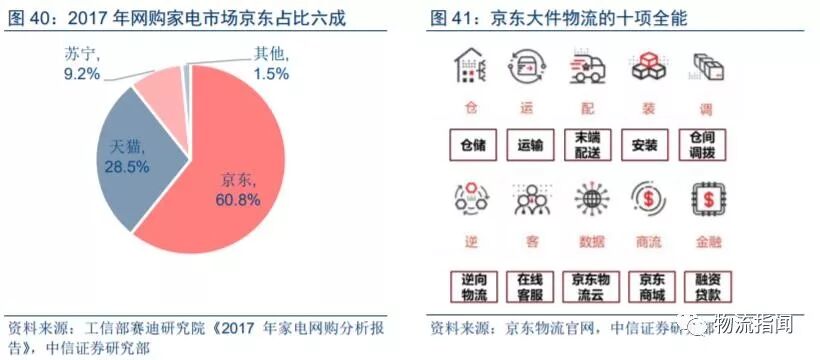京東物流的電商大件物流實力要強于順豐。根據工信部賽迪研究院《2017年家電網購 分析報告》,2017年國內網購家電市場中京東商城占比60.8%,大幅領先其他電商,較高的家電網購銷售額“倒逼”京東物流不斷提升大件物流實力。