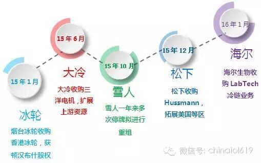 國內冷鏈市場資本、資源的整合全年都在進行中。2015年年初,煙臺冰輪通過購買冰輪香港100%股權獲得冰輪香港頓漢布什控股的98.65%股權,完善公司整體制冷產業鏈布局的同時利于整體業務國際市場開拓;6月份,大冷股份以2699萬元收購三洋電機持有的三洋高效制冷30%的股權,擴大其上游零部件資源,主要通過實現對冰山集團自身零部件配套和對外銷售提升集團整體盈利能力;雪人股份在一年里曾多次停牌,擬進行資產的重組與管理……