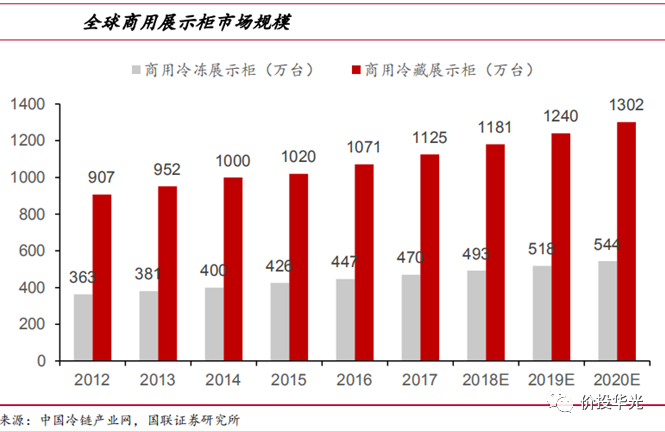 中國冷鏈產業網數據顯示,未來幾年全球商用展示柜的市場增長率將保持在 5%左右。2015 年全球商用展示柜有 1446 萬臺,其中,商用冷凍展示柜為 426 萬臺,商用冷藏展示柜達 1020 萬臺。全球商用展示柜市場未來將保持平穩增長,增長率大致保持在 5%左右,預計到 2020 年,全球商用展示柜將達到 1846 萬臺,其中,商用冷凍展示柜達到 544 萬臺,商用冷藏展示柜達到 1302 萬臺。按照一臺商用冷凍展示柜均價 4500 元,一臺商用冷藏展示柜均價 2500 元來測算,2018 年商用冷凍展示柜市場規模 222 億元,商用冷藏展示柜市場規模 326 億元,即全球商用展示柜規模大致 550 億元左右。