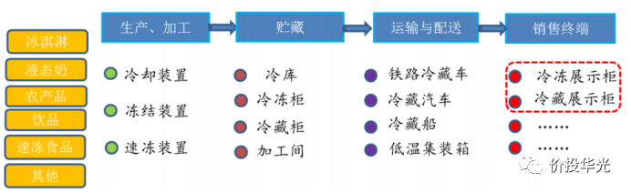 主要產品是商用展示柜,屬于冷鏈物流設備中的終端設備。公司目前的主要終端客戶集中在食品行業,主要經營冰淇淋、乳制品、飲品、速凍食品、冷鮮食品等快速消費品。按照食品儲藏溫度的要求不同,公司商用展示柜分為商用冷凍展示柜和商用冷藏展示柜。