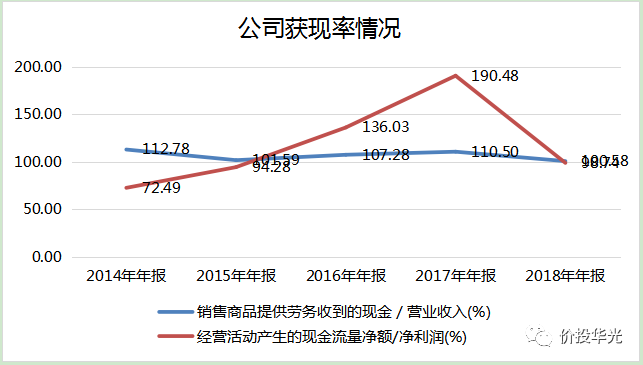 公司整體上獲現率較高,營業收入獲現率維持在100%-110%之間,但是2018年銷售獲現率低于100%,與上面所述的應收賬款大幅度增加,放寬信用賬期沖業績有關系。一般來說,制造業企業只要銷售獲現率維持在105%左右的水平,經營性凈現金流對比歸母凈利潤就不會難看。