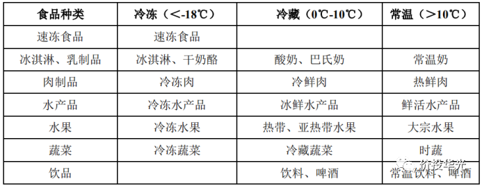 食品冷鏈物流是隨著城市化建設、人們生活水平提高、消費習慣變化等因素 影響而建立和發展起來的專業物流,主要的食品冷鏈物流包括食品的冷凍(藏) 加工、貯藏、運輸及配送、終端銷售等環節,以低溫的冷鏈物流最大限度的保持 食品的新鮮程度、營養、色澤和口味。目前冷鏈物流的食品通常主要包括易腐性 的農產品(蔬菜、肉制品、水果等)、水產品、速凍產品、冰淇淋、乳制品和飲 品,不同冷鏈溫度下對應的細分冷鏈食品種類如下: