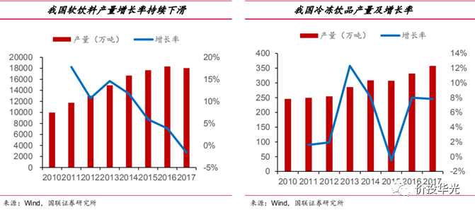 2017 年我國軟飲料產量達到 1.81 億噸,下滑了 1.6%,增速從 2013 年的 14.61%持續下滑。當前居民飲食結構大致穩定,對軟飲料的需求也趨于穩定,未來對商用展示柜的需求提升主要是商業銷售模式的轉變使得軟飲料冷藏銷售占比提升。從冷凍飲品產量來看,2017 年我國冷凍飲品產量 357.4 萬噸,增長 7.81%,2011-2017 年復合增長 5.51%,未來兩年有望保持每年 8%左右的增速。未來隨著便利店和自助冷飲售貨機數量的增長以及飲品冷藏率提升,有望帶動冷藏展示柜需求增長。