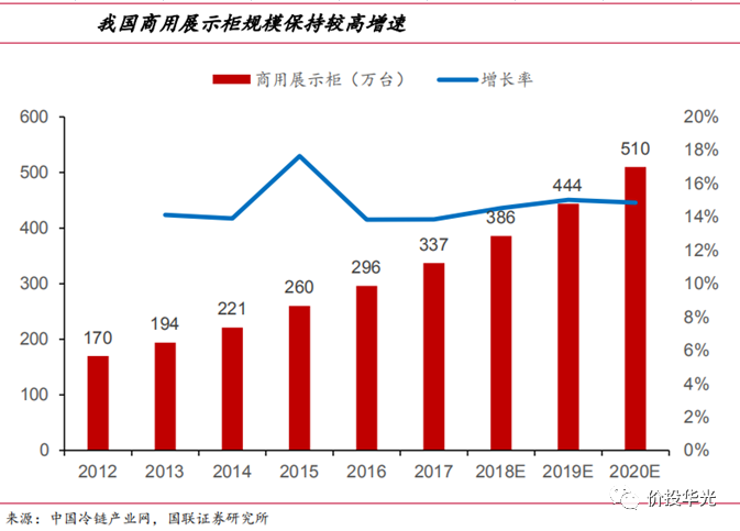 我國商用展示柜受益于城鎮化率提升和消費方式轉變,近年來的發展速度高于全球增速水平。中國冷鏈產業網統計數據顯示,2015 年我國商用展示柜達 260 萬臺,增速為 17.65%,預計到 2020 年,我國商用展示柜市場規模將達到 510 萬臺,年復合增長率達到 14.42%。按照冷凍柜和冷藏柜 1:2.5 測算,則 2018 年我國商用展示柜市場規模大致在 120 億元左右。