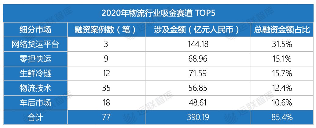 而商流的演進,也催化了冷鏈物流的成長。此前,運聯智庫根據公開資料整理的2020年中國物流產業整體融資數據顯示,全年100筆融資中,生鮮冷鏈領域的融資案例有12筆,總金額超70億元人民幣,占全年融資總額的15.7%。