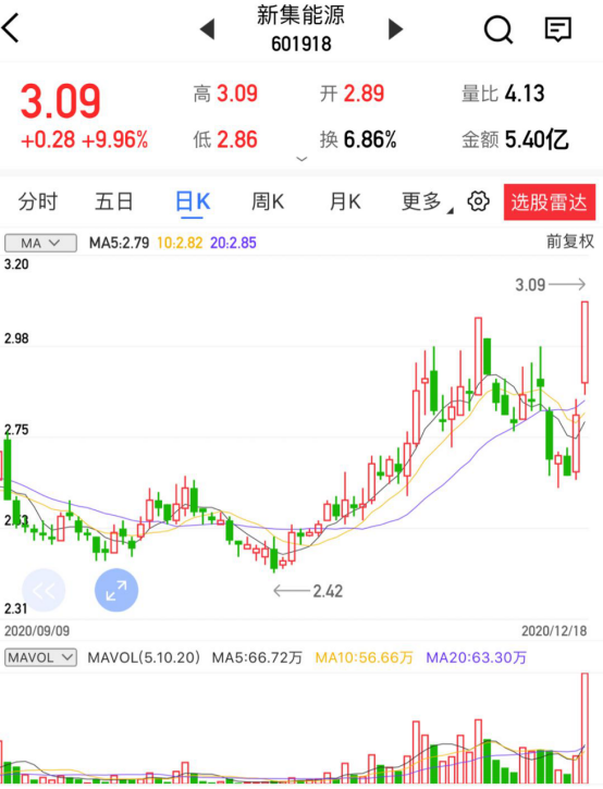 今日煤炭股大漲,新集能源漲停突破平臺,上方幾乎沒有套牢盤壓力,后市或仍有加速上行行情。
