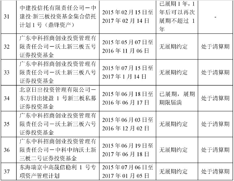 ① 2017年12月22日,發行人律師出具的補充法律意見書(五)披露了37名三類股東的存續期限(含展期約定)的情況,具體如下: