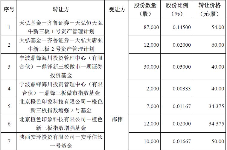 ① 2018年3月12日,發行人控股股東邵偉分別與天弘基金-齊魯證券-天弘恒天弘牛新三板1號資產管理計劃等發行人原十名股東簽訂《股份回購協議》,受讓該等股東所持發行人全部股份。本次股份轉讓的具體情況如下: