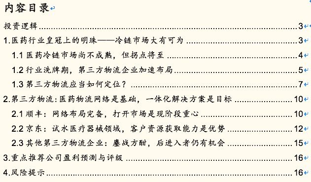 順豐網絡布局完備,打開市場是現階段重心;京東試水醫療器械領域,客戶資源獲取能力是其優勢。順豐通過在運輸的準確性和時效性、營業網點、物流跟蹤等方面的既有優勢,承接專業冷鏈物流與配送工作。由于藥品冷鏈物流市場過去多由具備藥品經營資質的經營企業各自承擔,順豐仍需逐步彌補起上下游客戶資源與品種資源不足的短板。京東物流將從醫療器械領域試水,逐步深入到醫藥流通領域,其電商平臺的定位,在上下游客戶資源的獲取上可能較順豐具有一定的優勢。