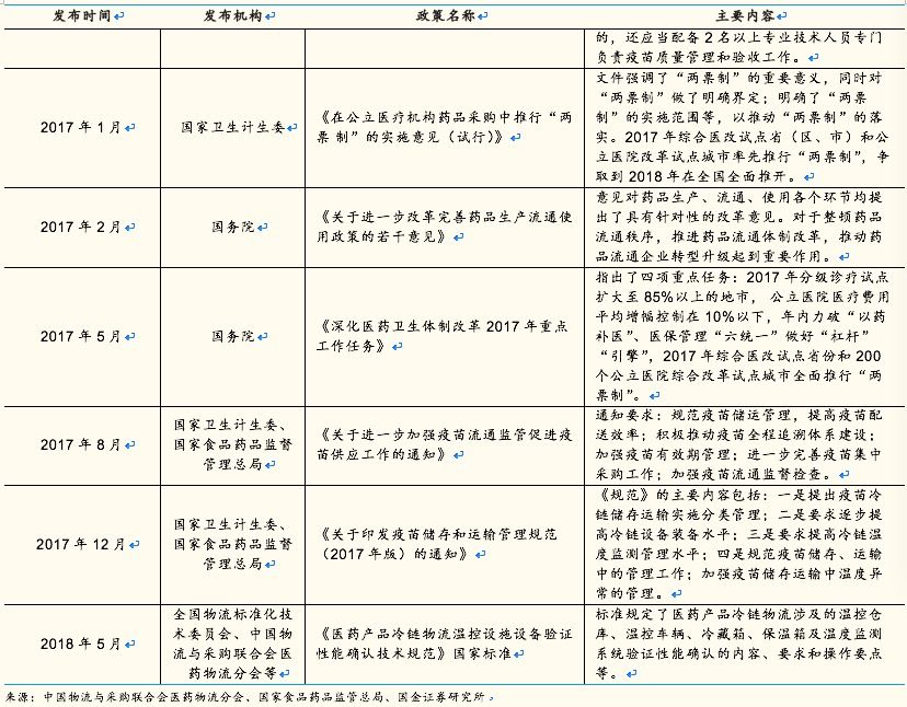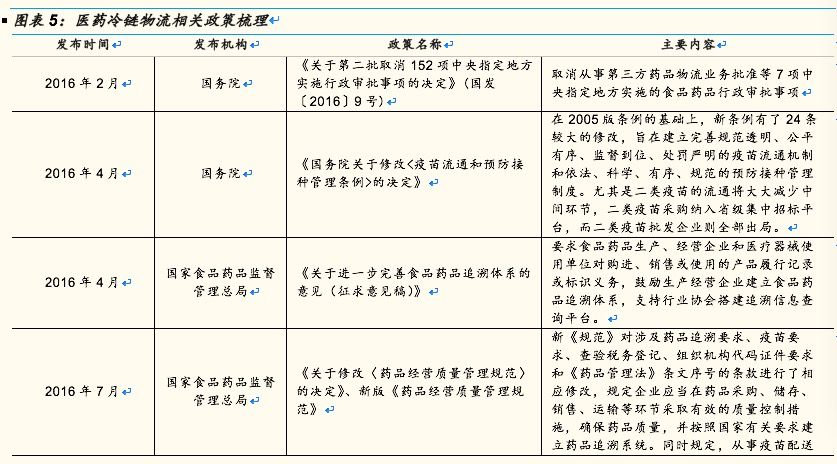 安全事件頻發,倒逼行業加速整頓洗牌。2016年4月,山東疫苗案后,國務院頒布新政《國務院關于修改〈疫苗流通和預防接種管理條例〉的決定》(下稱《決定》)。新政規定,二類疫苗采購納入省級集中招標平臺,而二類疫苗批發企業則全部出局。一系列事件的背后,反映的是冷鏈行業的供應和服務能力的缺陷。2017年,國家相繼出臺一系列要求加強冷鏈運輸貯存質量的政策;2018年5月,《醫藥產品冷鏈物流溫控設施設備驗證性能確認技術規范》國家標準正式實施。整個標準涵蓋冷庫、運輸、冷藏車、運輸車等四方面的運輸標準,以及可操作層面的執行依據,政策監管力度空前,顯示出國家規范藥品流通行業的決心和力度,將進一步倒逼行業加速整頓洗牌。