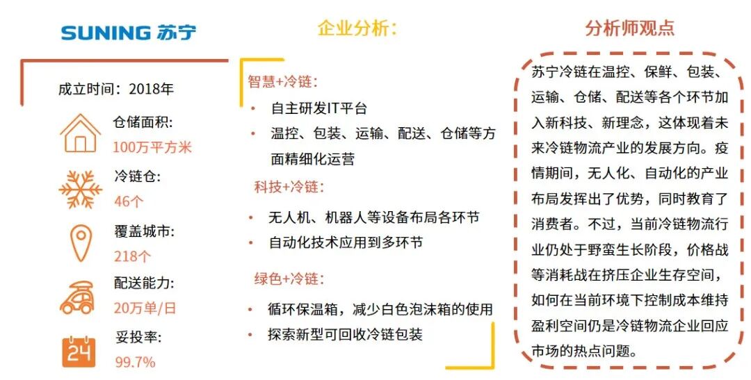 冷鏈物流在應用層的應用多樣,市場主體類別包括綜合電商平臺、垂直電商平臺、中國郵政、國鐵集團等帶有運輸特色的傳統公司、以及國際知名運輸公司和一些新入局的其他類別公司。物流冷鏈服務公司在冷鏈產業方面具有先天的優勢。