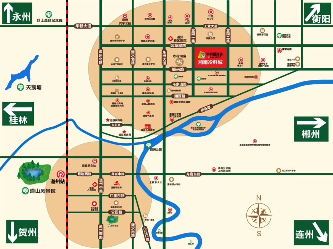 中農批冷鏈·湘南冷鮮城原名道縣綜合批發市場,于2013年6月13日由湖南省人民政府批準設立,并與2008年11月由省政府批準設立的具有同類型功能的永州公路口岸作業區統籌建設。該項目是目前湖南省人民政府批準全省唯一的農副產品集中驗放場,同時也是湖南省對接“一帶一路”戰略三年行動計劃之海上絲綢之路?東盟,完善在內陸地區的口岸支點布局。2019年5月9日此園區正式被納入粵港澳大灣區“菜籃子”產品配送體系,成為粵港澳大灣區“菜籃子”產品供應全國第一批六個配送中心之一。